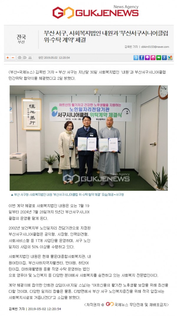 [언론보도:GUKJENEWS ] 부산 서구, 사회복지법인 내원과 부산서구시니어클럽 위수탁 계약 체결