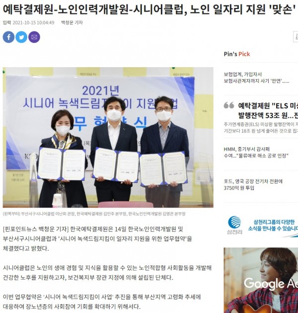 부산서구시니어클럽-한국예탁결제원-한국노인인력개발원, 노인 일자리 지원 '맞손'♥