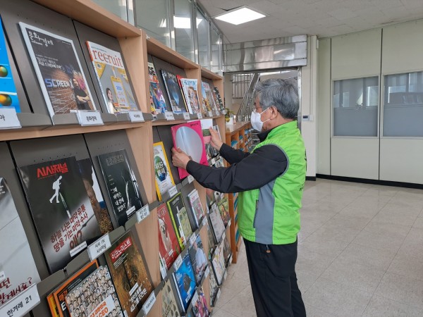 시니어북딜리버리 어르신이 도서관 내 책 정리를 돕는 사진입니다.