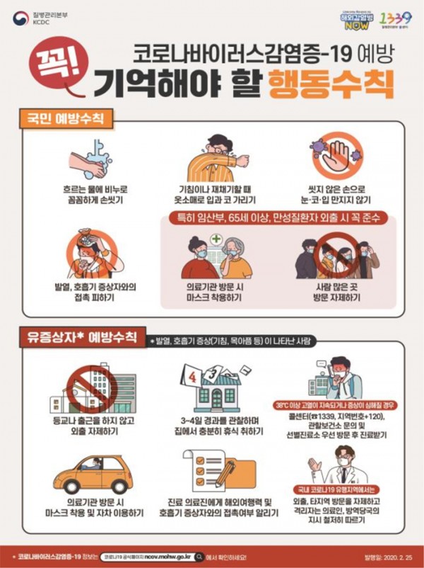 포토에세이 HOME STORY 포토에세이 공유하기 인쇄하기 코로나바이러스감염증-19 예방 [꼭! 기억해야 할 행동수칙] 페이지 정보 작성자 부산서구시니어클럽 댓글 0건 조회 11,432회 작성일 20-04-03 10:59 본문 코로나바이러스감염증-19 예방 [꼭! 기억해야 할 행동수칙] 목록 이전글자가격리 대상자 생활수칙 20.04.03 다음글코로나19극복을 위한 가족 스트레스 마음 처방전 20.03.30 댓글목록 댓글목록 등록된 댓글이 없습니다.